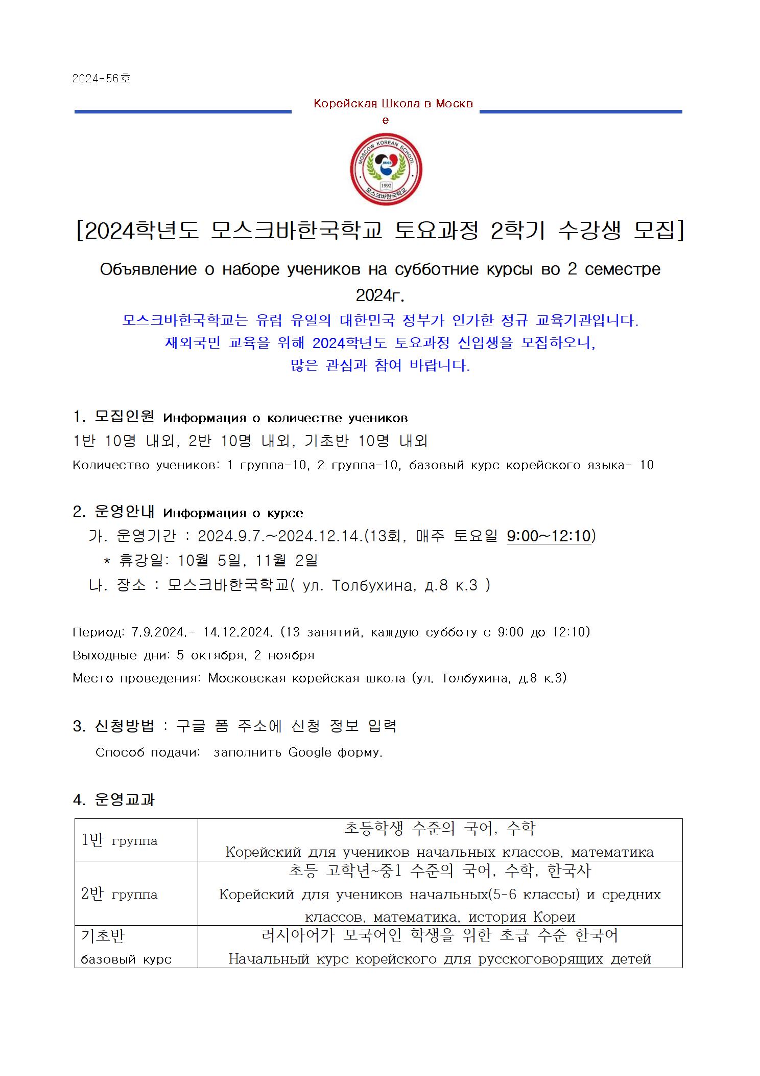 °¡. ¿î¿µ±â°£ : 2024.9.7.~2024.12.14.(13ȸ, ¸ÅÁÖ Åä¿äÀÏ 9:00~12:10)