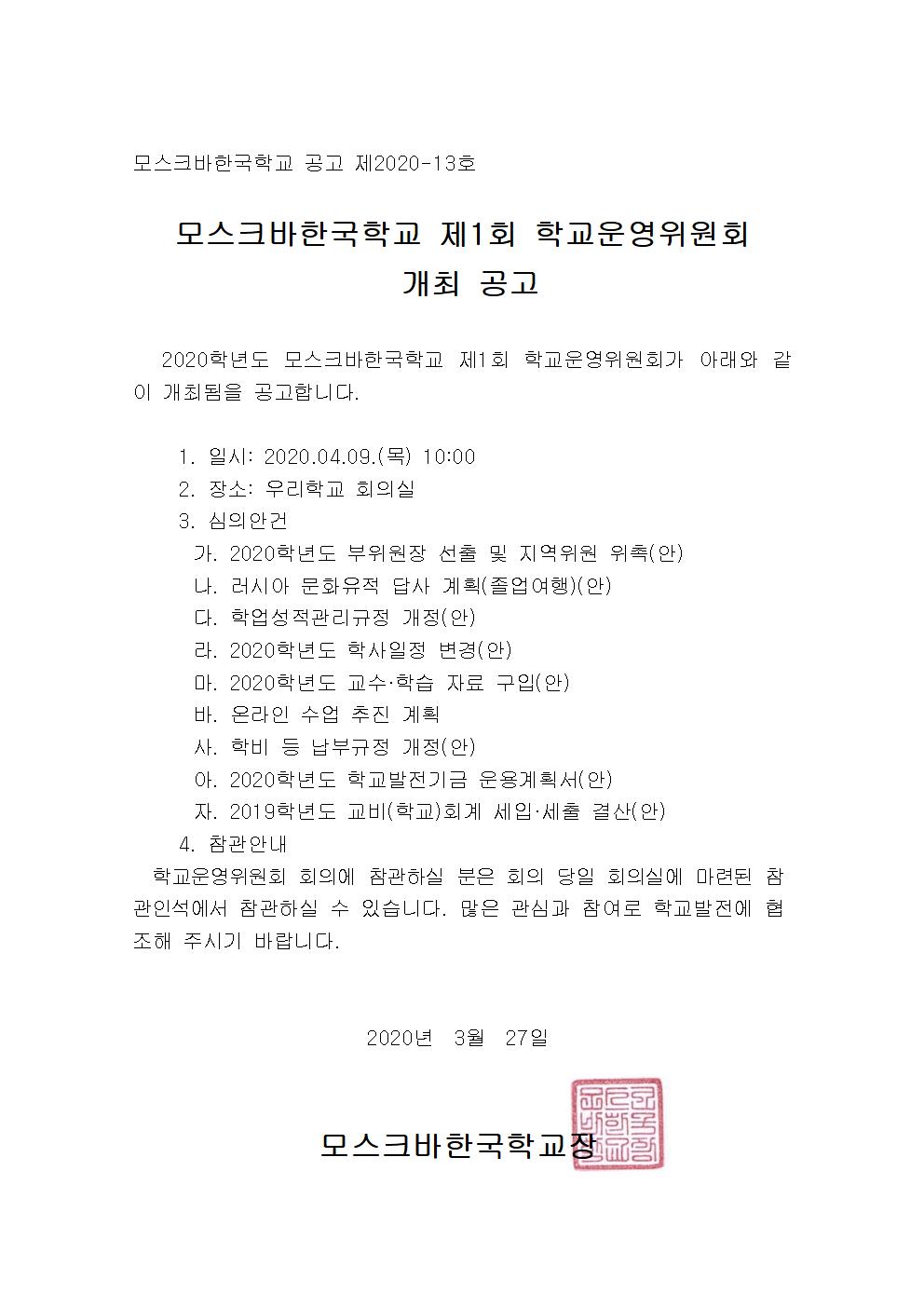 2020Çг⵵ Á¦1ȸ Çб³¿î¿µÀ§¿øÈ¸ °³ÃÖ °ø°í